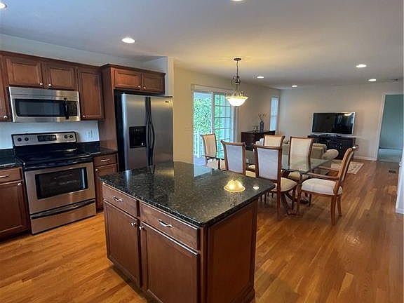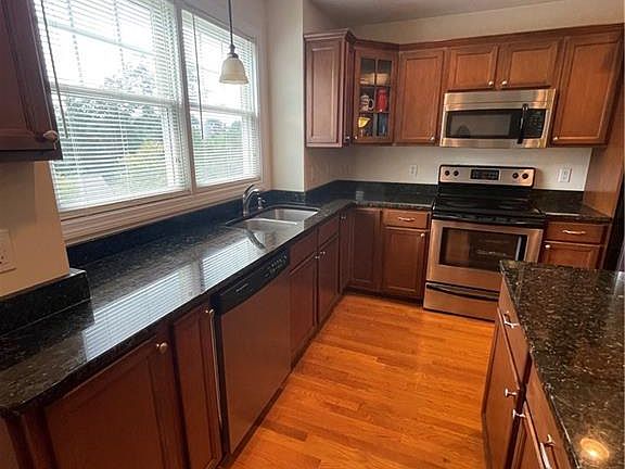 Beautiful, spacious 3 bedroom, 2 full bath duplex style condominium located in highly desirable Woods Walk Commons. Gleaming hardwoods throughout the open main level -excluding the bedrooms with cozy wall to wall carpeting. Kitchen with black granite counters, island and stainless appliances flows into the dining/living room combination perfect for gatherings! Slider leads to side, covered deck which connects into wrap around porch. Large Master suite with double closets and full bath, 2 additional large bedrooms with double closets on main level along with guest bath and laundry. Generously sized bonus room upstairs perfect for Family room, Media room or even Guest quarters! Full dry basement with great storage and door to private one car garage. Home backs up to private wooded rear yard. Truly a home you can be proud to call your own without the outside maintenance!