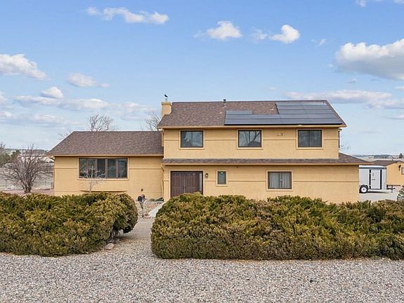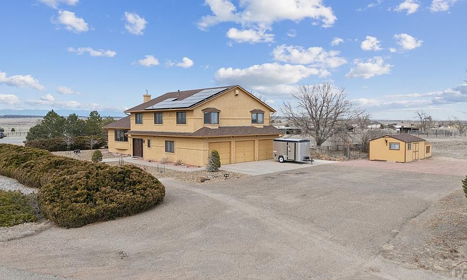 BUYERS!!! Look no further, This is the home that fills all your wants and needs and requires little to no updating and repairs. When I state "Pride of Ownership" this is the home for you. Fantastic care within the home and also the maintaining of the extra large property outside. IMMEDIATE OCCUPANCY for all buyers. Nearly 3000 Sq. Ft. of heated area all of which is updated and upgraded. The attached three garages are nice sized and give you more space for storage. There is lots of storage throughout the home. Stunning home has amazing views including Pikes Peak and Sangre de Cristo. As you enter the home you will enjoy the huge foyer that leads you to a huge game/room. The updated kitchen includes new luxury vinyl, a new Center island with new cabinets all with granite countertops. All SS appliances and washer and dryer included. As you start to go upstairs you will LOVE the wider staircase with gorgeous hardwood flooring and a majestic built-in book shelves. All four bedrooms are nice sized, have new baseboards, crown molding and newer carpeting. All upstairs bathrooms have new cabinets and countertops (Very Modern) The property has a humidifier, whole house fan, and two water spigots. There is a lrg. detached shed included. RV parking. There is power to shed and greenhouse. Lastly, there is new Solar System installed on the roof. The bill was over $200 and even higher in the summer. This system allows buyer to take over payments of $138. upon approval vs. $200 +