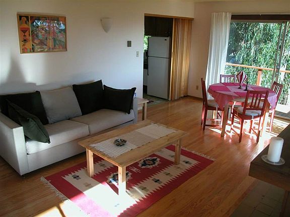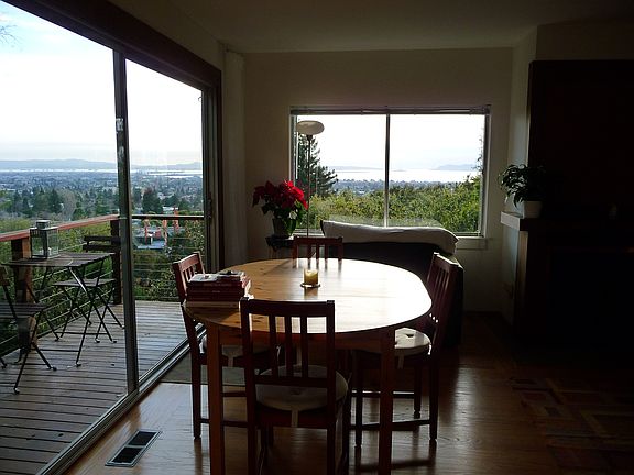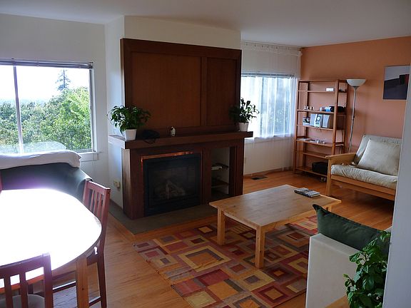quiet, green retreat just two blocks above campus, in the private cul-de-sac (Panoramic Hill location without the climb) Golden Gate views 2BR, 1bath apartment; part of a duplex (acoustically insulated from rest of house) fully furnished: equipped kitchen, TV, hi-speed internet, phone, linens walking to UC Berkeley, swimming pools, restaurants, hiking trails in Strawberry and Claremont Canyons Preserves new cozy heating gas fireplace, recently remodeled bathroom, hardwood floors off-streat parking; laundry; non-smoking, no pets Short term rental can be negotiated (long term gets priority) $800/week (plus $100 cleaning fee) Max 2 person occupancy, no roommates. Owner pays for trash, sewer, and water. Renter responsible for utilities.