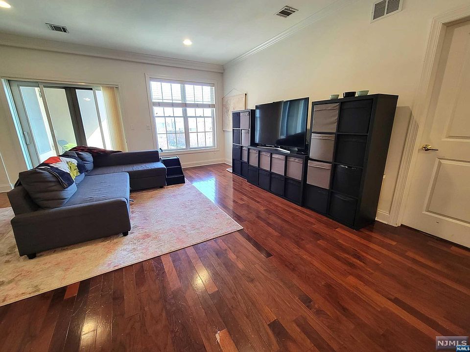 Very Large and Spacious, Top Floor unit with 1590 square feet is ready to be Your New Home! Open Concept Living with Large Granite Island, Stainless Steel Appliances, Recessed Lighting, Central Air, Crown Molding and Full-size Washer/Dryer in unit! Private Balcony plus Tons of Natural Light gleaming in through your Large Pella Windows w/Hunter Douglas Blinds. Primary Suite includes Walk-in Closet and Bath with stand-up shower. Second Bedroom also has Walk-in Closet too! Third Bedroom/Den/Office is almost 11x13'. Newest Condo Building in Hackensack! Conveniently situated within walking distance to restaurants, shopping, Essex St. Train Station and NYC Bus Stop is right across the street. Maintenance includes Two Indoor Parking Spaces and Newly Equipped Gym. Plus available Visitors Parking. Pet Friendly Building! Investors welcome, can immediately rent out. Building is not FHA approved. Highest and Best due Wed 4/12 @ 6pm
