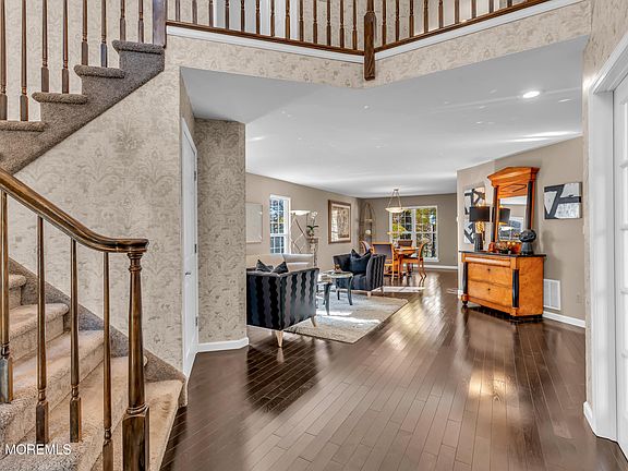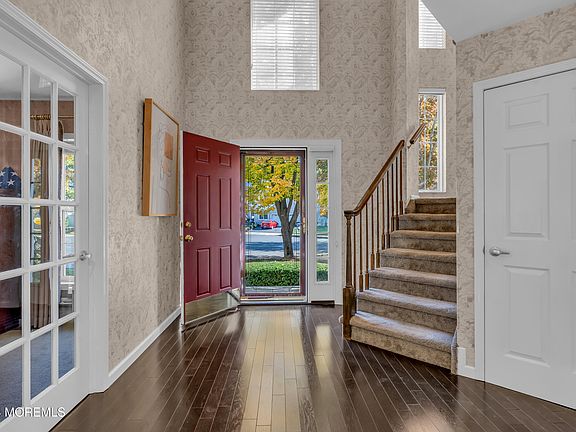 OLD BRIDGE TOWNSHIP! Zip Code is Matawan 07747. Nestled on a cul-de-sac, this casually elegant home is designed to impress! The two-story foyer, filled with natural light, features a stunning open staircase. The spacious living/dining rooms with wood floors lead to a beautiful kitchen with a center island, granite countertops, and a chic glass backsplash—ideal for cooking and dining. The family room, open to the kitchen, includes a gas fireplace flanked by windows. A first-floor office makes working from home convenient. This well-designed floor plan is perfect for everyday living and entertaining. Upstairs, the luxurious primary suite offers two walk-in closets and an oversized bathroom with vaulted ceilings, double sinks, a jetted tub, shower stall, and water closet. Three more bedrooms, main bath & laundry complete the upper level The recently waterproofed full basement with French drains offers a great opportunity to expand your living space. Step outside to the two-tier deck and enjoy the tranquility of a private, natural setting that beautifully showcases the changing seasons.