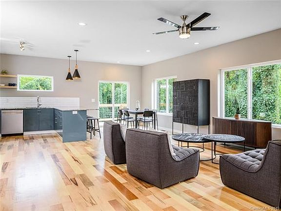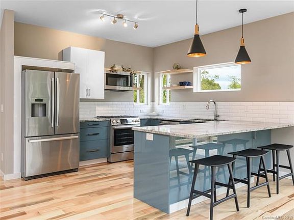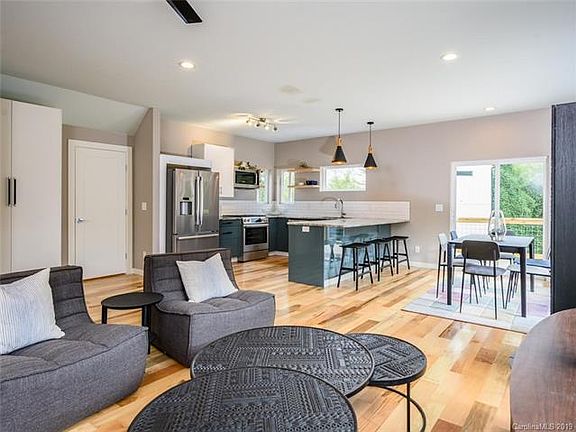 A rarity for Asheville! One block from New Belgium, this new modern masterpiece by LMT Homes features an Aging in Place design and offers flex space perfect for home office or play, convenient covered parking, laundry on every level, and spacious bedroom w/en-suite on main -- making everyday life comfy and convenient. Entertain in the oversized kitchen with stainless appliances and natural gas, use the large open floor plan for family gatherings, or enjoy a warm cup of coffee on the deck as the leaves turn and fall, exposing winter views of downtown AVL. A Green Build/Energy Star Certified home, the builder's expertise shines through with bold fixtures, Appalachian mix hardwood floors, tongue and groove ceiling accents, and a design that will grow with your family -- all of this tucked away in sought after River Arts District/West AVL.