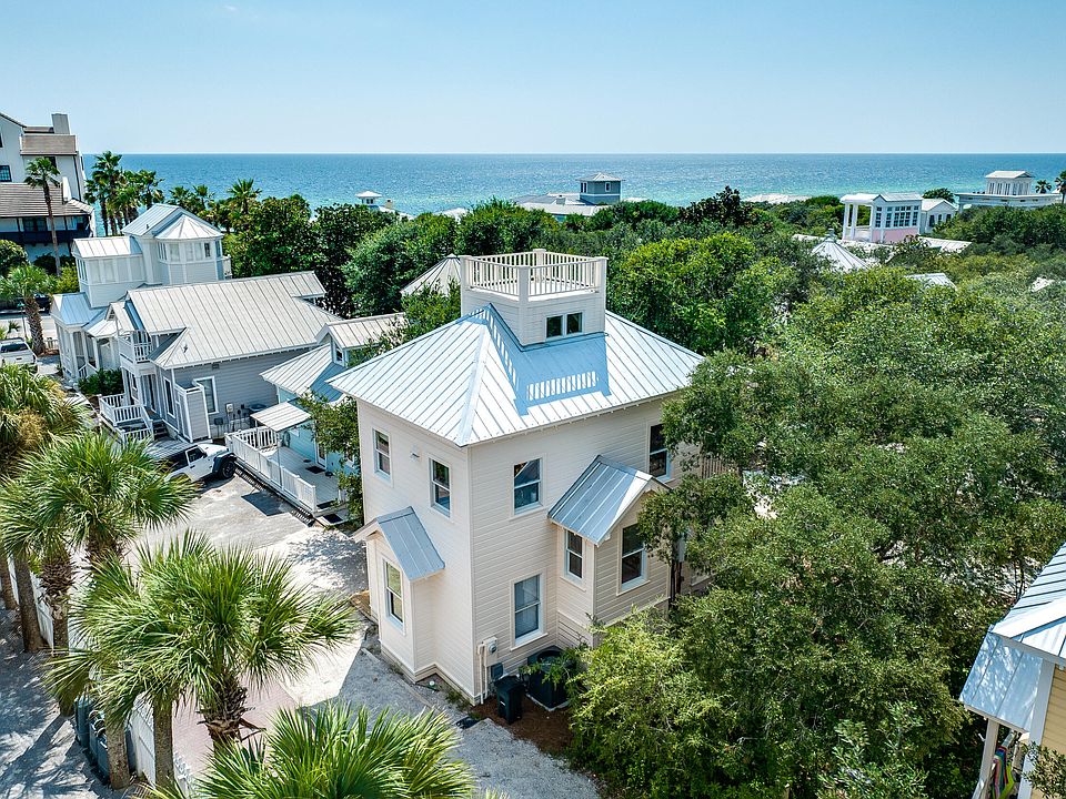 Upstairs, a soaring second floor delivers volume and natural light, housing a brand-new designer kitchen, wet room-style bath, dining area, and an airy living space that opens to a treetop balcony overlooking the lush Rosewalk green space. The third-floor loft, complete with a twin trundle and peek-a-boo Gulf view, adds versatility and charm.
