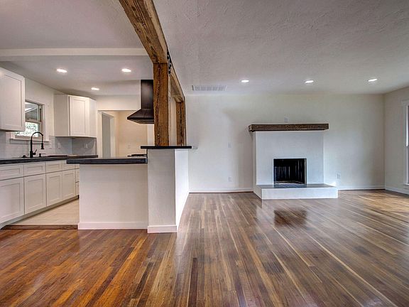 Step into the newly remodeled kitchen featuring sleek black gas appliances, white cabinets, elegant concrete counters, and stylish tile floors. The original hardwood oak floors have been meticulously restored, enhancing the home's character. With the thoughtful inclusion of reclaimed posts and beams, the ambiance evokes a cozy ''Pottery Barn'' feel.