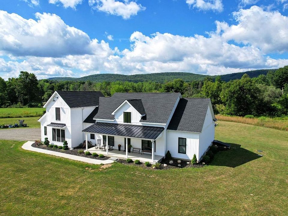 STUNNING Modern Farmhouse style home tucked well off the road on a picturesque 16 acre parcel with the year round Virgil Creek running through the rear. Enjoy endless nights of bonfires, camping, swimming and trout fishing on this amazing natural playground. 2-year-old quality built home with no expense spared and detailed not thought through! Over 3200 square feet of amazing space with cathedral ceilings, covered porches, brick fireplace, open floor plan, guest suite, wood flooring, 3.5 baths, in-floor radiant heat, heated garage, bonus room and a sprawling primary suite, bath and closet. 9' ceilings on both the main floor and the ginormous expandable basement, also with in-floor heat. Custom kitchen opens to living room and offers high end appliances, dry panty, butler pantry, 6 burner stove with pot filler and mixed quartz counters. Primary suite at one end and 3 additional bedrooms at the other. Convenient edge of village location but a pure country setting. 10 miles to Ithaca.