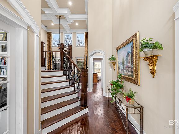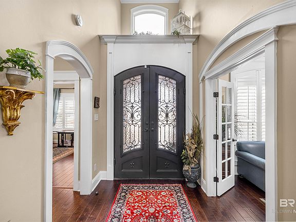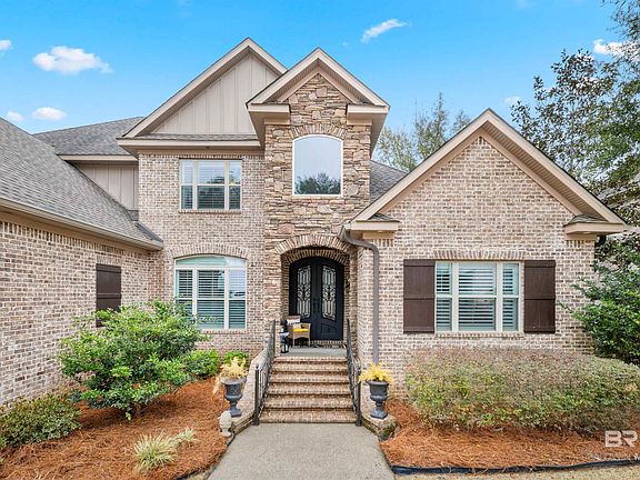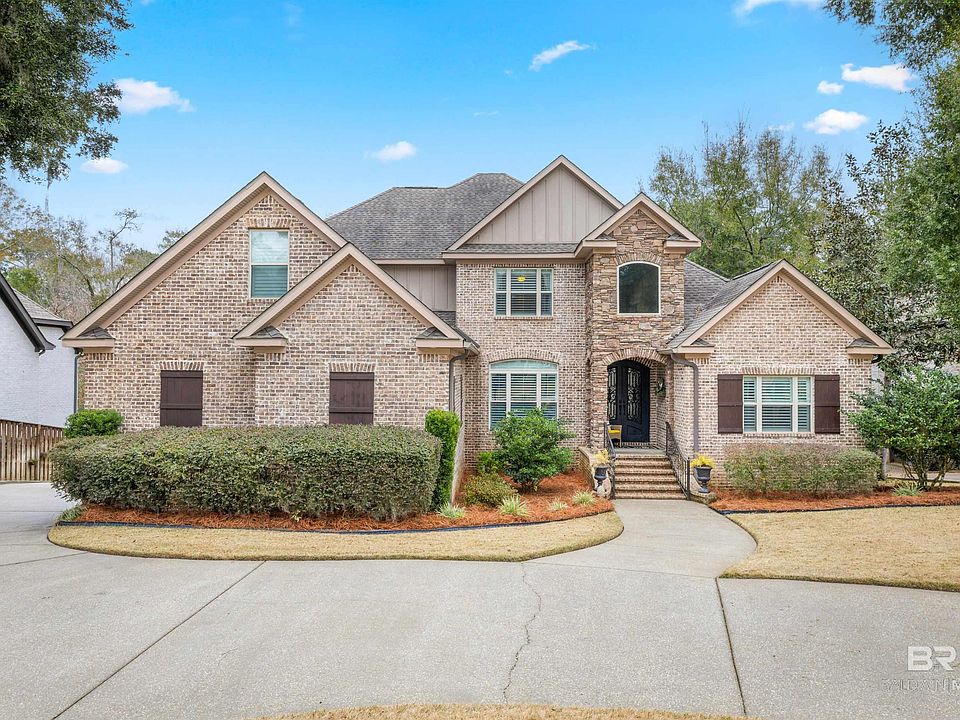 Experience the epitome of luxury living in this meticulously crafted 2-story brick craftsman home, offering breathtaking views of Mobile Bay. The grand foyer welcomes you with soaring ceilings and gleaming hardwood floors, setting the tone for the exquisite design that awaits. Enter the office or study, adorned with built-ins and French doors, providing a sophisticated space for work or reflection. The family room boasts a wall of windows framing picturesque views of nature. Marvel at the 20 ft. coffered ceiling and enjoy the warmth of the double-sided gas log fireplace, creating a cozy ambiance. The kitchen is a culinary masterpiece, featuring off-white painted cabinets, a tiled backsplash, center island, double ovens, and a 5-gas burner cooktop—all complemented by rich hardwood floors. The kitchen seamlessly connects to the breakfast room and formal dining area, complete with a gas log fireplace, leading to a screened patio for al fresco dining. Retreat to the primary suite, a haven of comfort with a double tray ceiling, hardwood floors, and an ensuite that rivals a spa experience. Indulge in the walk-in tiled shower, jetted tub, double vanities, and a huge walk-in closet. Tall ceilings add to the sense of opulence. The main level boasts a private guest suite, providing unparalleled comfort for visitors. Upstairs, discover 3 bedrooms, 2 baths, and a bonus room—perfect for entertainment or relaxation. The lower level offers a 740 sq ft unfinished basement plumbed for a bathroom, providing a blank canvas for your personal touch. Step out to the huge, covered paver patio and fenced yard, creating an outdoor oasis with a 3-car garage providing ample space, this home seamlessly blends luxury, comfort, and functionality. All Information provided is deemed reliable but not guaranteed. Buyer or buyer’s agent to verify all information.