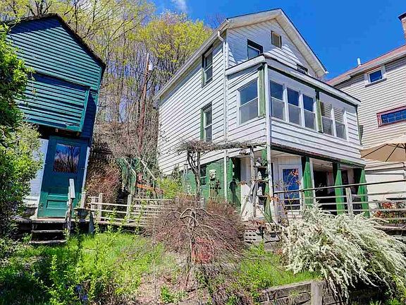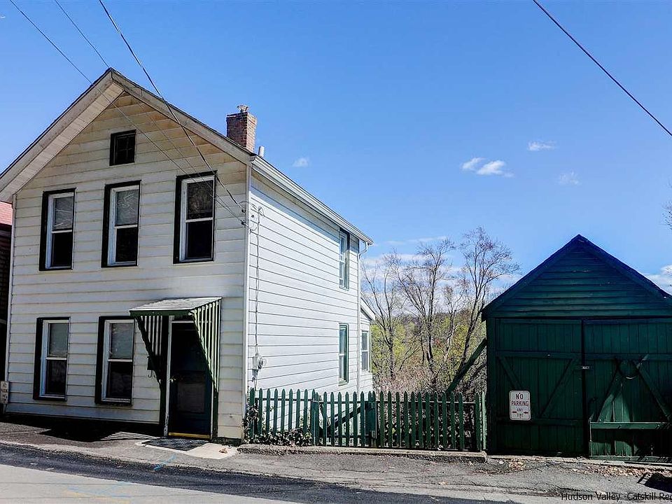 Prime Rondout Location with Delightful Water Views. Meander down a quite verdant road, discover your vintage home. Property includes two parcels: One with house and sweet original barn/garage; the other an adjoining water-facing buildable lot, running all the way to German St. Character abounds in this circa 1890's gem: Original millwork, hardwood floors, beautifully preserved tin ceilings. Three levels of living space: Enter a light- filled first floor with living room, dining room and an enclosed sunroom that runs the entire length of the house at the back - A lovely spot to curl up with a book or sip your morning coffee while taking in the views. Full bathroom and eat-in kitchen on lower level, leading to a sunny outdoor sanctuary with fruit trees, flowering shrubs and space to plant your garden (or to build a second home or studio). Two bedrooms and half bath upstairs. Main bedroom has a small adjacent room for work, play, or a great walk-in closet. Driveway and off-street parking on rear lot. Steps away from one of the Hudson Valley's most scenic Waterfronts and all that it offers. Launch your boat or kayak from the nearby dock. A perfect combination of Charm, Location and Potential in Kingston's Historic Rondout District.