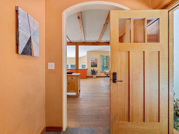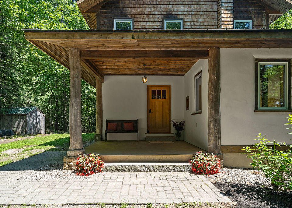 If you're looking for an environmentally friendly home that mixes sustainable and green elements with modern design, this Freeport home exceeds expectations. Exceptionally built with custom features throughout, this 4/5 bedroom home is nestled among pristine woodlands. An inviting front porch welcomes you home. Inside you'll find a welcoming mudroom with a large room for coats, shoes, and bags. Impressive open living space boasts rustic touches, such as ceiling beams, wood burning stove that can heat the whole home, and beautiful hardwood floors. Custom cabinets and hardware pair with farmer's sink and 5 burner top-of-the-line gas range to create a dream kitchen. Generous pantry for your convenience. Kitchen opens to a dining space illuminated by the glorious south -facing window wall. Primary bedroom down the hall has wide-planked hardwood floors and ample closet space. First half bath features a stunning antique Korean teak sink, while the full bath boasts Marmoleum floors, a hygienic, durable floor made from natural materials and recycled content. Take note of the deep set windows, a unique design result of the eco-friendly and high performing straw bale insulation. One more first floor bedroom/study with the possibility of adding a deck. Upstairs you'll find 3 more bedrooms and a full bath.The lowest level is where the fun happens, because opposite those oversized windows is an awesome rock climbing wall! Get some activity time in right in your own home. Ample full daylight basement space adjacent, with a separate room for a den/in home schooling setup. Back patio affords space for relaxation - set up your grill, lounge chairs, and enjoy your leisure time! Solar roof panels for hot water and electricity are an added bonus. Enjoy all of this, plus you'll be at ease knowing you're investing in an eco-friendly home that's close to Freeport Village and I-295 just a short drive away. Don't miss out on this fantastic home!