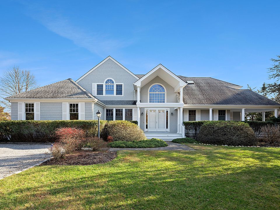 Private and serene, this 4-bedroom, 3 and one-half bath home is situated down a long driveway on 1.87 acres with expansive water views of the bay inlet. This immaculate Post Modern offers a stunning double-height foyer opening to the living room with coffered ceilings, a wood-burning fireplace and beautiful two-story window that fills the room with natural light. The open floor plan features the kitchen appointed with a center island, stainless steel Viking and Sub-Zero appliances and a cozy breakfast nook, a dining area, and den with built-in bookcases. A generously sized, separate primary suite has high ceilings, French doors leading to the deck, gas fireplace, two walk-in closets, a spa bath with double vanities, jacuzzi tub, separate steam shower, and private water closet. The laundry room, a powder room and the attached two-car garage complete the first floor. A cascading staircase leads to the second floor and a gracious landing with sitting area. Two guest bedrooms, one currently being used as an office and the other a gym, share an adjoining bath. Plus, an additional en suite guest bedroom awaits. The outdoor area offers a heated Gunite swimming pool surrounded by two levels of decking, one for sunning, the other for entertaining, and an expansive, lush lawn. Truly a special home that offers top craftsmanship in the desirable south of the highway area of Westhampton, just a short distance to the shops and restaurants of Westhampton Beach Village and fabulous ocean beaches.