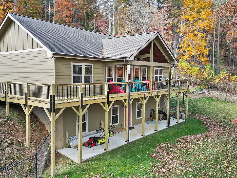 This 3 bedroom 2 bath home has a rustic yet modern feel located just outside of downtown Blairsville. Upon entering, you'll be captivated by the open living spaces that effortlessly flow from room to room. The spacious living area leads to a well-appointed kitchen in the heart of the home equipped with granite counter tops and stainless-steel appliances. The main floor features the master suite with two spacious walk-in closets, custom tiled shower and garden tub in bathroom, exposed wood beams, and ambient lighting. Located off the kitchen you will find a mudroom and laundry room equipped with barn style doors for privacy. Not only is the inside of the home exquisite, but the wrap around porch offers the perfect views of the North Georgia mountains. The partially complete terrace level has a finished room, stubbed bathroom, framing, HVAC, and electrical ready to be complete. In addition to the home you will find beautiful landscaping, a fenced in yard, and a 2-car detached garage with spacious storage area above offering easy access to the front deck!