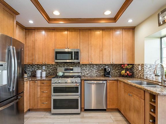 Eat-In Kitchen with Granite Counters and Tiled Back Splash, Maple Wood Cabinets and Stainless Steel Appliances.