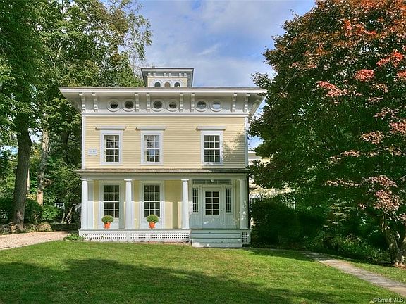 Nestled in The Kings Highway North Historic District with a paramount location, this Italianate antique has been restored and loved for over 20 years by one Westport family. The results are stunning; the pristine home and grounds are truly wonderful. Gracious public spaces welcome you on the ground floor with magnificent rosewood and wide plank pine flooring, 6ft high windows with original or restoration glass, fireplaces, period molding, paneled doors and hardware. Providing sweeping views of the property, the Chef's kitchen with new Bosch, Subzero and Wolf appliances leads to the Butler's Pantry, laundry center and mudroom with side door. The front to back Master suite has exposed beams, a sitting room and an en-suite bath with dressing room. The three additional bedrooms are flooded with natural light and share a pair of fully renovated full baths. Clever, converted top-floor attic space with wainscoting and signature porthole windows on all four sides - perfect for family room, study or home office. Beautiful level yard with historic barn, majestic stone walls, mature gardens and fruit trees. Room for expansion, larger patio and pool. Seize this opportunity to own (and walk to town from) one of Westport's original treasures: The Jesse Bradley House, c.1840 - transformed for the next generation.