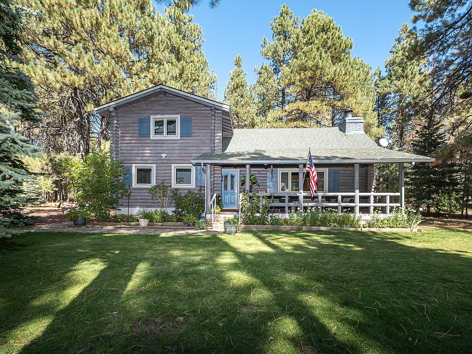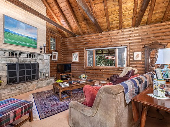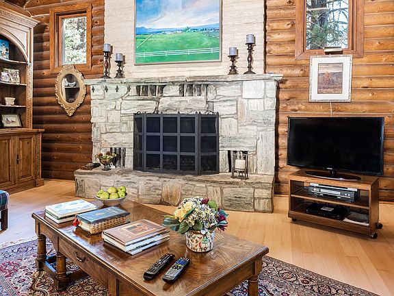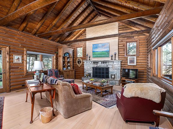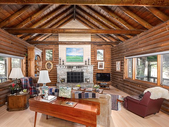Completely remodeled log cabin HORSE PROPERTY that sits buried in a stand of Spruce and Pine trees on ten acres of horse property. Long driveway set back from other homes and surrounded by acreage affording lots of privacy. Large bedroom downstairs with full bath and two bedrooms upstairs share a bath. Charming log beams enhance the home in the cathedral ceiling great room. Huge focal stone front wood burning fireplace. Multiple decks and a detached one plus car garage. Beautiful heavily treed acreage that includes seasonal stream, and varied elevation. Several additional possible home sites should someone care to build or add horse accommodations. Corrals are already in place for horses, newly surveyed. This property has awesome potential and is unique to area and very SPECIAL