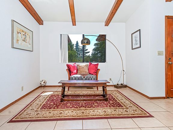 Watch out! You will fall in love with me as I'm a keeper! I 'm a charming 3 bedroom 3 bath southwest style home on a corner cul-de- sac. As you open my front door you will find an Open Living room/Dining Room with Wood Beamed Ceilings, a corner wood stove, and sliding doors that spill out onto a lovely wrap around deck that is also accessible from my Primary Bedroom Sun room and 2nd bedroom ensuite! My Back yard splendors offers lush green grass (perfect for Fido), a flagstone patio complimented with a firepit, and Red Rock Views! And it is completely fenced. My Kitchen is accented with a cobalt blue tiled center island with loads of wood cabinetry and a walk in pantry. Primary Bedroom has a remodeled 3/4 bath, walk in closet and its own enclosed AZ room/office that opens
