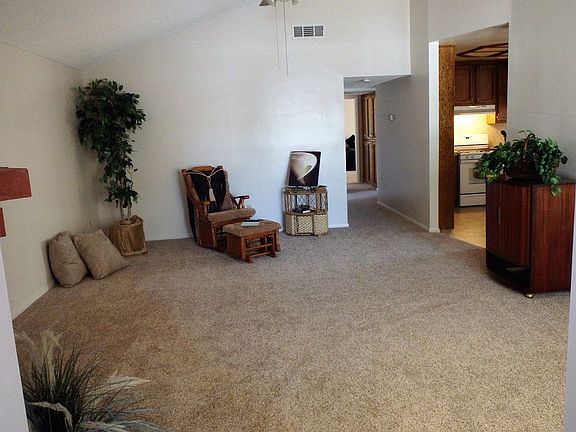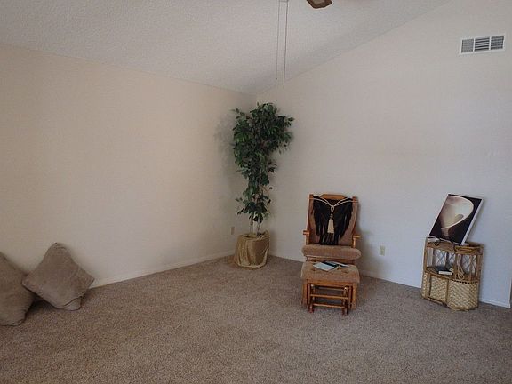 Brick pillars welcome you inside to spacious living rm with fireplace at one end, cathedral ceiling, fan. New paint inside and outside trim.All new carpet!Kitchen features new range, dw, hood, & faucet:newer tile counters & backsplash. Walkin pantry & inset curio cabinet. Open to dining area w/french door to shaded patio.Lots of hall storage.Guest bath has tile counters & tub. Master suite is generous with lge walkin closet, french doors to patio. Master bath has large shower w/ glass drs and tiled counter. Two guest bedrooms across the hall: one has walkin closet and the other has built in desk. Enormous backyard has block wall on the west and wood on the other 2 sides.Long shaded patio on east side of house. Another patio done in pavers on the west side of yard under large shade tree. Cooler on roof 3 yrs old; new pads!
