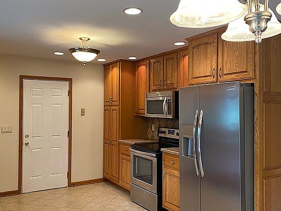 Deck off kitchen with sliding glass doors. Attached 2 car garage with drywall finish. Also an outside storage building. Also new stainless appliances in kitchen.