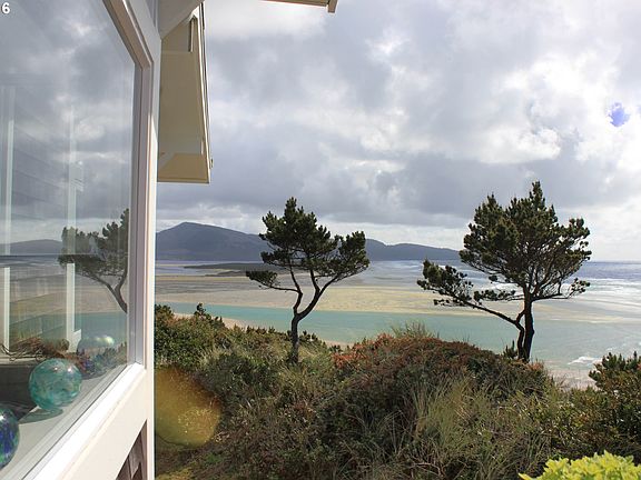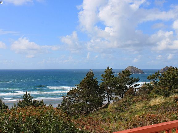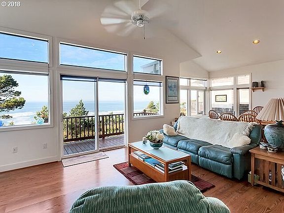 OCEANFRONT HIGH BANK panoramic, dramatic view of whitewater waves rolling onto Netarts Spit, sandy beach& majestic 3Arch Rocks. Kiwanda model with 2 ensuite bdrms + large den, 3 full baths, rich dark oak floor in greatrm, window seats, wood burning frplc. New carpet being installed in January. Steps to beach stairs in one direction and bocce ball park in the other. One owner home, well loved.
