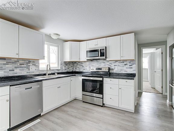 Gorgeously remodeled in 2023, this 4-bedroom, 2-bathroom home offers 1800 sq ft of living space and an attached 2-car garage. Situated in a peaceful neighborhood with mature trees, this property boasts a freshly painted exterior and a generous driveway. Enjoy a "like-new" interior with 2023 updates throughout: new lighting, hardware, carpet, custom tile backsplash, stainless steel appliances, counters, ceiling fans, doors, luxury vinyl floors, and windows. The open-concept floor plan features a spacious living room with ample natural light and a stylish kitchen with ample cabinet space. Two bathrooms offer modern finishes and the backyard provides space for outdoor living and entertaining. Conveniently located near Fort Carson, shopping, dining, and outdoor recreation. This property is a Short Sale. It has been winterized and power is off Please take into consideration when showing.
