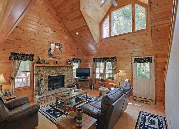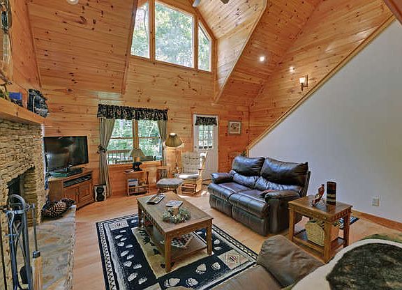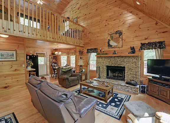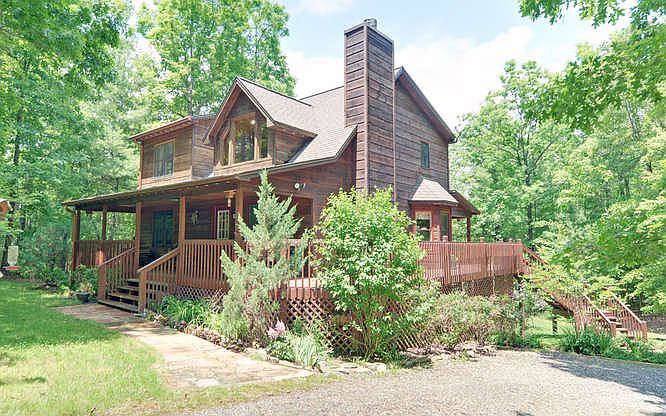Home away from home with this beautiful, comfortable, rustic 2 bedroom, two and half bath home. Have the mountain view without the steep drive. Spacious great room with stacked stone fireplace, lots of windows, and cathedral ceilings. Large loft for extra beds/media/office space. Master suite has nice bath with jetted tub, separate shower, walk in closet. Finished basement with office/bedroom, game room and outdoor fire pit for entertaining. Level terrain landscaped for easy maintenance and privacy. Three separate outbuildings. A great place to bring friends or relax with family.