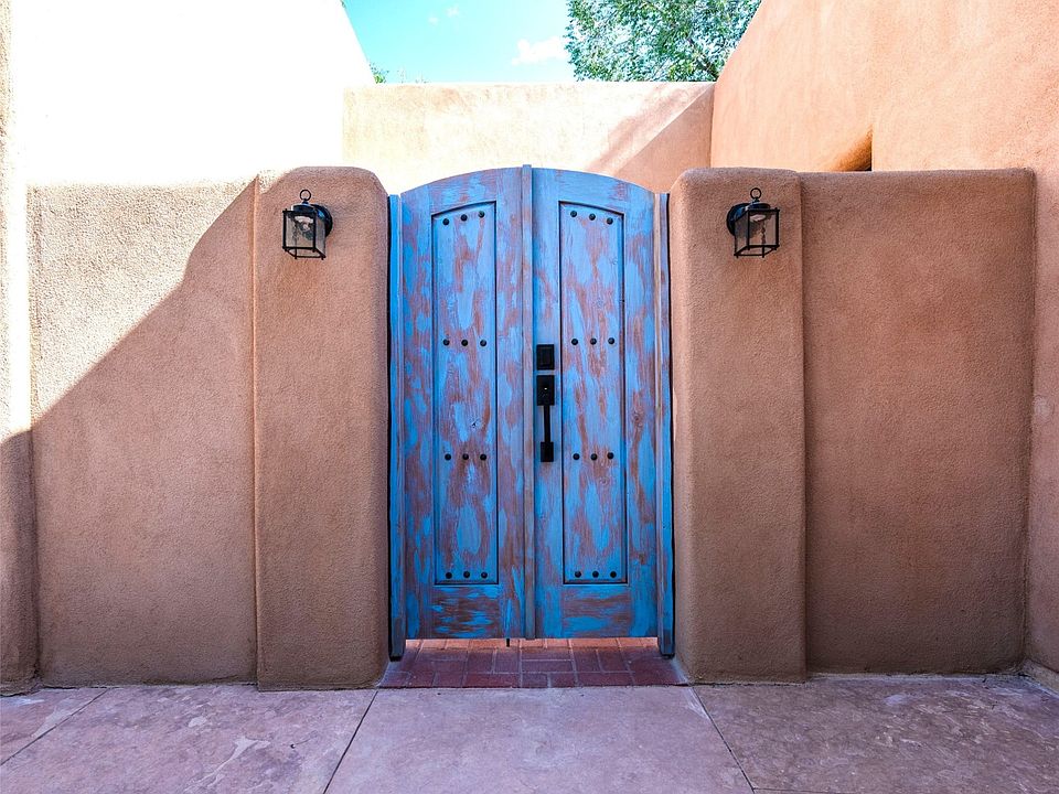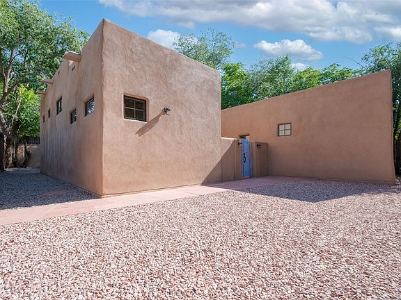 New construction throughout with a beautifully designed and hand-crafted adobe remodel and addition, this home blends classic Santa Fe style with modern comfort. A charming private courtyard greets you before the front door opens to a light-filled living room with high ceilings, exposed vigas, hand-troweled plaster walls, wood floors, and a custom-designed fireplace with quartz stone mantles. The gourmet kitchen features custom Alder cabinets, a built-in Wolf cooktop and oven, Fisher & Paykel refrigerator/freezer, Bosch dishwasher, quartz stone countertops, custom hardware and lighting, and travertine stone tile floors. The thoughtful three-bedroom, two-bath floor plan provides excellent separation between the luxurious primary suite and the additional bedrooms. One bedroom, located near the kitchen with its own entrance, offers flexibility for guests or use as a home office/den, with easy access to the courtyard. The primary suite exudes a spa-like feel, with warm plaster tones, natural wood finishes, custom Alder cabinetry and vanities, Italian porcelain tile surrounds, quartz countertops, a whirlpool bath, and a Kohler shower with body sprays. Additional bath features include mirrored, lighted anti-fog cabinets, a built-in makeup table with a lighted mirror, and elegant fixtures throughout. Other highlights include a custom-built entry gate, solid Alder doors, refrigerated air conditioning and heating, Pella windows, and Hunter Douglas blinds. Ideal as a full-time residence or a Santa Fe getaway, this home combines craftsmanship, comfort, and style in a prime location.
