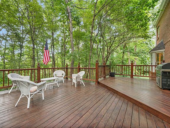 The Updated Kitchen has new granite countertops, beautiful white cabinets, and an enormous wood island that leads you onto a tranquil back deck nestled in the trees. The Family room is right off the Kitchen with a log-burning fireplace. The front office has glass pocket doors for extra light and privacy. The Zen powder room is simply stunning.