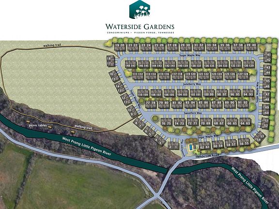 OWNER/AGENT. Introducing Waterside Gardens Condominiums! Located in the heart of Pigeon Forge on 40 beautiful acres along the Little Pigeon river, and minutes from the wonders Dollywood, Gatlinburg and the Smoky Mountains, this new construction development features all single-level, two-bedroom, two-car garage duplexes, so every condo is an end unit. The brick and stone exterior means you can enjoy zero maintenance living from your covered front porch or back patio. Best of all, you get to customize all interiors from a wide selection of granite kitchen tops, birch cabinets, LVP flooring to be used throughout, and any paint color you choose. Each condo also features a stunning stone fireplace, living room and bedroom ceiling fans, stainless appliances, cathedral ceilings, wide 36'' doors and the option of expanding the back patio, or adding a sunroom or screened porch. Three-bedroom, single-level units are available on limited lots.