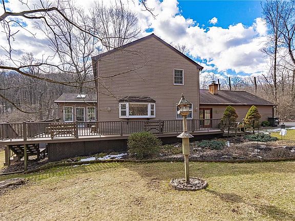 Situated on over an acre of land, this four bedroom 2 1/2 bath home has so much to offer. Entering the sizeable foyer, you're welcomed into this lovingly cared for home. Next, the formal living room w/ hardwood floors also carries through into the formal dining rm. Continuing into the updated kitchen featuring quartz countertops, ceramic backsplash, cherry cabinetry & large center island, perfect for meal prep. French doors lead out to the composite deck from the kitchen for gatherings & barbecues. Adjacent to the formal living & dining rm is the serene sunroom. Picturesque windows surround this sundrenched rm with ceramic tile & French doors plus access to the deck. Step down into the cozy family room w/ brick surround, wood-burning fireplace as the heart of the room. Access the back porch from the French doors while bringing in sunlight. A laundry rm & half a bath complete this main level. Upstairs, you’ll find a very spacious master bedrm that leads to the master bath w/ walk-in closet. Three additional bedrooms & a hall bath, plus a bonus storage closet complete the second floor. A partially finished basement w/ built-in shelving provides an added living space while there is plenty of storage area included in the basement. A two car garage is attached to the home while a two car detached garage is ideal for extra parking. The backyard has lots of room for baseball games and picnics. There is so much to love in this spacious home that is ready for its new owners to enjoy!