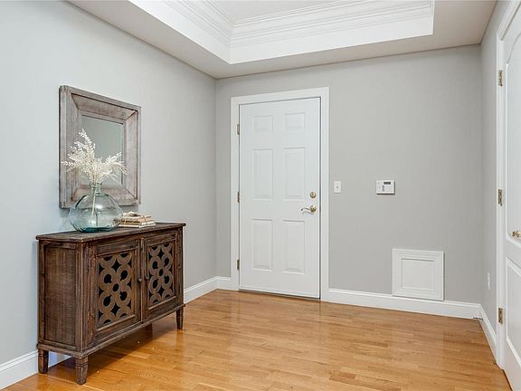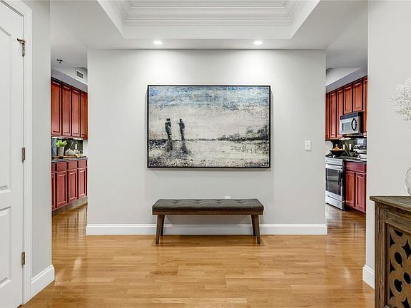 Exquisite coffered ceilings adorn the bedrooms, living room, dining room. Recessed lighting and rich hardwood flooring grace the main living areas, entry foyer, and hallways, creating a warm and inviting atmosphere. The gourmet kitchen is a chef's dream, featuring 42" cherry cabinetry, two built-in pantries, granite countertops, and top-of-the-line stainless steel appliances. It seamlessly flows into the breakfast room, providing access to the oversized balcony. Windows galore bathe this beautiful unit in natural light. Don't wait—seize the chance to experience the height of luxury living. 2 indoor parking spaces included. Location: Upper Level