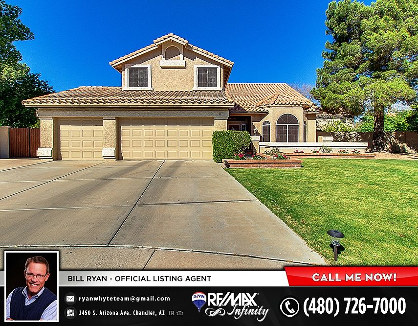 This is the kind of home you are proud to own! Original owner has meticulously maintained this home inside and out. One of the largest cul-de-sac lots in popular Andersen Springs. This lovely home features North/South exposure, 4 bedrooms plus a den, 2.5 bathrooms, and a 3 car garage with RV gate and parking. Inside you will love the brick fireplace, spacious living and dining spaces, updated tile, plush carpet, granite counters, and remodeled bathrooms with tile and glass enclosure. Step out the French doors to the huge back yard that is so perfect for entertaining with an oversized covered patio, sparkling salt water pool, lush green grass, mature citrus trees. Walking distance to A+ top rated ACP-Erie School, 1.5 miles to the 101, Chandler Regional Hospital, shopping, restaurants and more. Simply the best central location. Don't miss out! 540 N Longmore St, Chandler AZ 85224. 4 bedrooms, den, 2.5 bathrooms, 2728 square feet, 3 car garage, pool. Built in 1987 by Richmond American Homes in Andersen Springs. MLS #5400866. Call The Ryan-Whyte Team at REMAX Infinity 480-726-7000 for more information. Website Link: http://www.ryanwhyteteam.com/listing/cms/mls-5400866-540-n-longmore-street-chandler-az-85224/ You Tube Link: https://youtu.be/jmegIl8KgD4