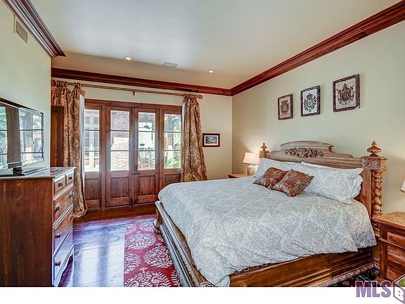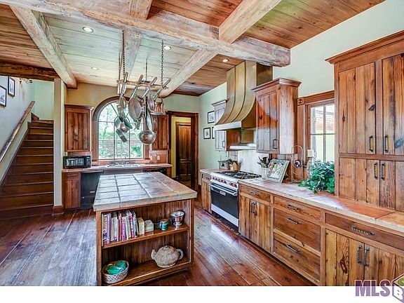 Beautiful custom home featuring 2 master bedroom suites and 2.5 baths with an abundance of unique architectural details - reclaimed wood ceilings and fine wood work throughout the home; wide plank reclaimed hardwood floors; floor-to-ceiling windows; custom hand-carved dual gas/wood burning fireplace, and much more. The kitchen includes custom reclaimed old pine cabinets, a large center island, a Vulcan range, and a stand-alone ice maker. The kitchen also features a pot rack and custom iron light fixtures. The great room and dining room have 11 foot ceilings with floor-to-ceiling windows and two unique chandeliers. Large master suite includes 2 walk-in closets, his/her vanities, whirlpool tub and separate shower. The home surrounds a brick courtyard and features a separate covered porch, as well as a large balcony overlooking the courtyard. Five Bevel gas lanterns are placed throughout the exterior of the home. Home also includes storage pigeoneer and 2 car garage. Did not flood during recent flooding.
