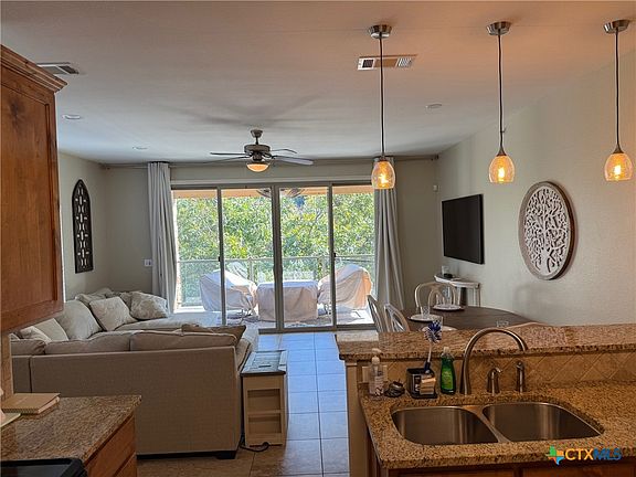 Walk to the water at this Guadalupe River front Condo. Located at the 4th crossing just minutes from Canyon Lake, Whitewater Amphitheater and many other Hill Country attractions. This is a 3 bedroom/2 bath, 3rd floor/corner unit featuring Granite countertops, stainless appliances custom cabinetry and tile work. Enjoy the natural beauty of the Guadalupe River from the Covered balcony of take your lawn chairs to the water and watch the Tubers floating by. This is a very popular STR destination. Furnishings convey. Outside storage unit conveys.