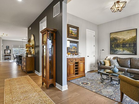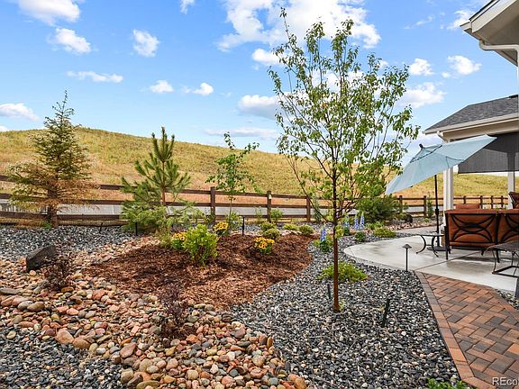 Better than new! This Toll Brothers ranch home, with considerable upgrades, still competes with builder's pricing. Start with a truly usable low maintenance backyard, includes an extended patio area with gas line for grill and fire pit, paver walkways on both sides of the home, dog area, planting beds with trees, bushes, perennials and fencing. A custom entertainment bar in the great room, Subzero wine refrigerator, cabinets and sink, makes this home an entertainer’s dream come true. A gourmet kitchen, extra large center island, custom built coffee bar. Pullouts in all lower cabinets, Thermador microwave drawer and Cove dishwasher were added features to make this an amazing kitchen that will stand the test of time. The primary bedroom suite boasts a spacious walk-in closet with built ins for maximum use, including drawers and laundry bins. Additional upgrades include, Hunter Douglas window coverings, most are motorized. The Regency at Montaine is a 55+ community has a Colorado resort style clubhouse that includes a fitness center, pool, tennis and pickle ball courts. Close to shopping, restaurants, hiking and biking trails. Conveniently located 5 minutes south from Downtown Castle Rock, This home makes living easy!
