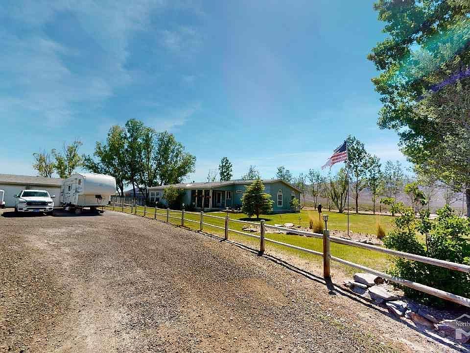 Large 4 bed, 2 bath home on acreage in a cul-de-sac. Beautiful landscaping, mature trees, Grass galore. Pad ready for hot tub in the back. Dog Run. 2 Car garage. 2 storage sheds. Garden area. Covered deck in the front. Inside over 2100sqft open, split bedroom floor plan. Vaulted ceilings. Pellet stove is 1.5 years old. Most of the carpet is new in September and is pet and child proof. Life proof new flooring in both baths and they will leave flooring for the laundry room.