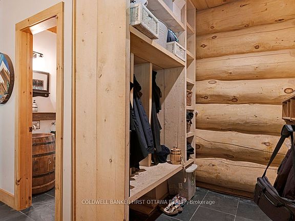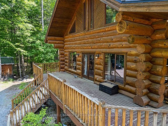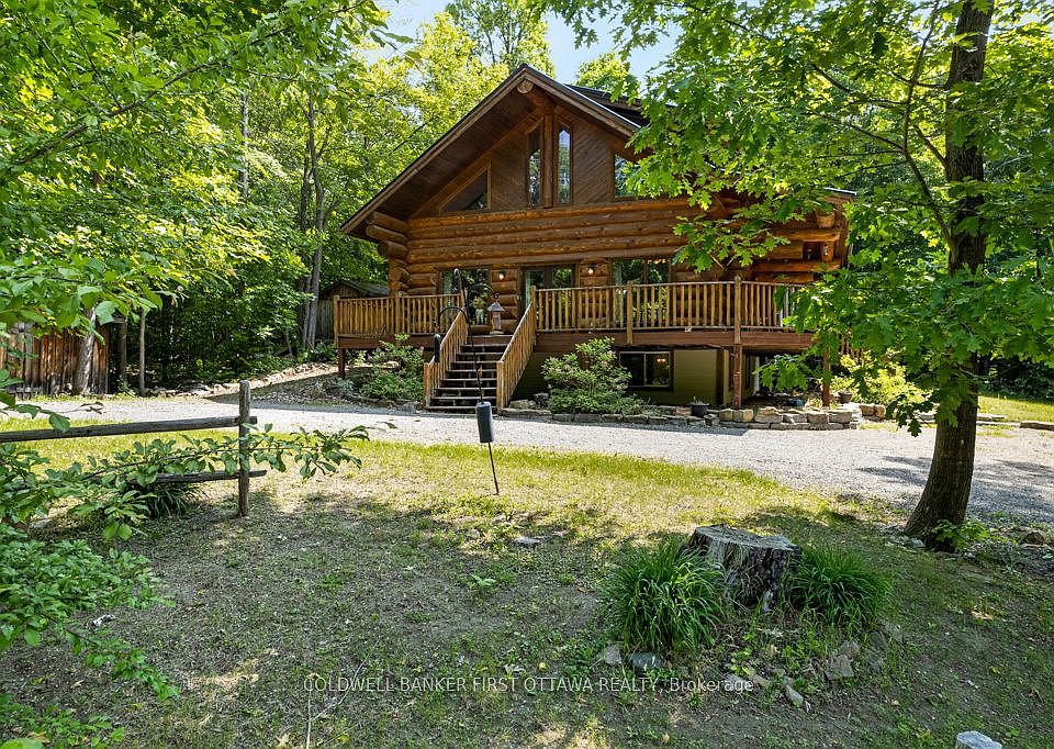 Bring your skis and snowboards! Steps from Pakenham ski hills is custom 2009 log home on large half acre with magnificent sunsets over the hills. The impressive 3+1 bed, 2.5 bath home features grand wrap-about verandah. Light-filled open-concept home built with 1.5' diameter logs from British Columbia. Front foyer has slate-like ceramic floor and nook with built-in shelves for coats, hats & boots. High ceilings and floors of hardwood, softwood and ceramic tile. Livingroom 10' ceiling and tall windows for natural light. Dining room tall windows overlook great outdoors. Kitchen has peninsula with breakfast bar that sits 7-8 comfortably; birch cabinetry includes pantry and drawer divided to fit cooking pots & baking tins. Family room soaring cathedral ceiling and superior, top-of-line, Masonry woodstove from Vermont. Double doors open to expansive verandah that welcomes you to sit down, and relax. Main floor powder room has ceramic tile floor and endearing wooden barrel vanity with hammered copper sink. Solid wood staircase to primary bedroom with 12' ceiling and double closet. Two more bedrooms and upgraded bathroom of porcelain plank floor, double quartz vanity, deep soaker tub and walk-in ceramic shower with rain head. Lower level rec room, gym, fourth bedroom and 3-pc bathroom with glass shower and another wooden barrel vanity including hammered copper sink. The well-built home has energy-efficient ICF foundation & Thermolec boiler to heat water for radiant floor heating through out the lower level. Second floor heated with radiant wall heaters. Outside, you have chicken coop, garden shed and woodshed. Bell Fibre available & cell service. Located in family friendly neighbourhood of Mount Pakenham, On paved township road with garbage and recycling pickup plus school bus stop. Five mins down the road is Pakenham golf course; another minute further, is delightful artisan Village of Pakenham on shores Mississippi River for swimming, boating & fishing. 25 mins Kanata.
