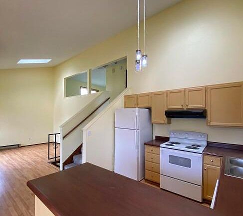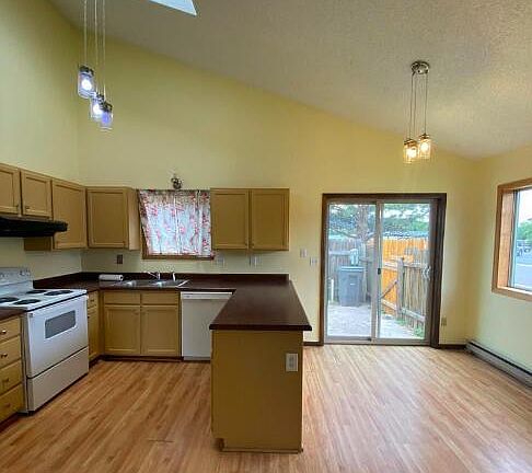 This three bedroom two bath home offers easy low maintenance living. With new carpet, fresh paint and new appliances its move in ready! Enjoy the open concept kitchen dining and living area with high ceilings and wood burning stove. On the upper level you'll find the main bedroom with walk-in closet and a private deck, a full bathroom and a second living area that can easily be converted into a fourth bedroom. The garden level features two bedrooms, a laundry area, a three quarter bath and an easy access crawl space for storage. The windows and sliding glass doors were replaced in 2019. Fenced yard great for a garden, kids and pets.