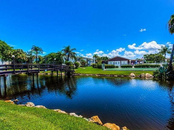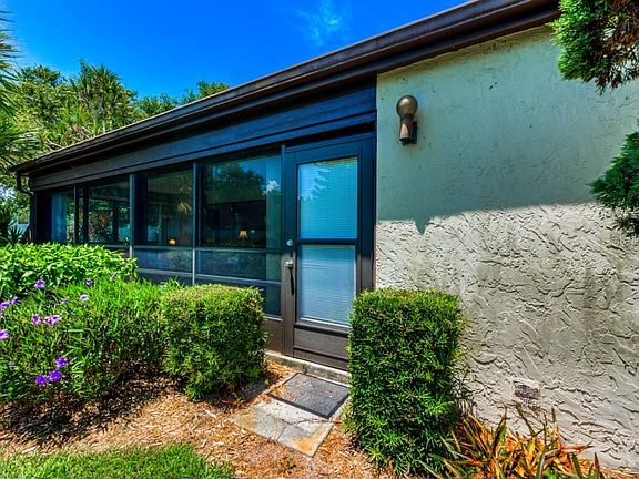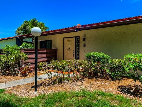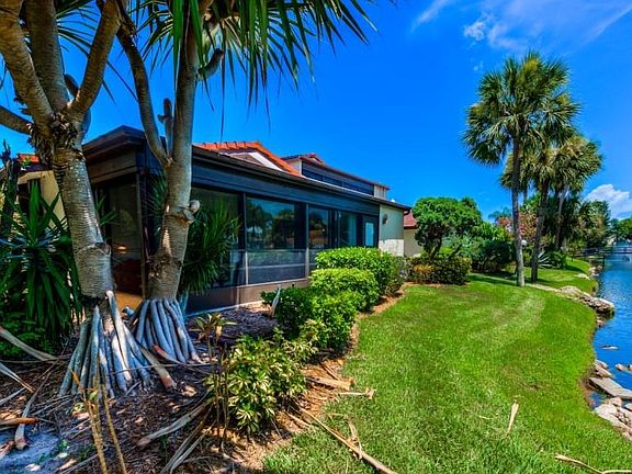 Welcome to your new home in paradise perfectly located close to shopping, dining and the crystal sandy beaches of the Suncoast. This two bedroom two bath turnkey furnished end unit boasts an updated kitchen complete with quartz countertops, soft close door and drawers and loads of cabinet and countertop prep space. The fenced patio area off the kitchen nook is a cozy place to take your morning coffee and catch up on the daily news. The moment you enter through the front door you'll appreciate the vaulted ceilings, clerestory windows and the open great room plan. The Florida room features a wet bar and lovely views of the lake with its footbridge to the large heated community pool, shuffle board and clubhouse. With one story and no neighbors above or beside you, this villa lives and feels like a single home. The bedrooms are smartly split on opposite sides of the home giving privacy to all. The owners suite has sliding doors that open to the the Florida room if desired giving you beautiful lake views to wake up to each morning. The primary bathroom has rich marble countertops and a large marble soaking tub with shower combination. The spacious indoor laundry room includes a washer, dryer, laundry sink and additional storage. The second bath has a walk in shower and a vanity seating space. The guest bedroom is roomy, light and bright and has pull down attic stairs that lead to tons of additional storage space complete with standing room. Morton Village is a vibrant 55+ community with luscious tropical landscaping peppered throughout the grounds. Water, sewer, trash, internet and cable are provided by the association. Don't miss the opportunity to make this affordable villa your own. Schedule your private showing now!