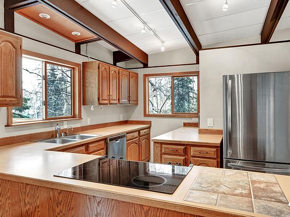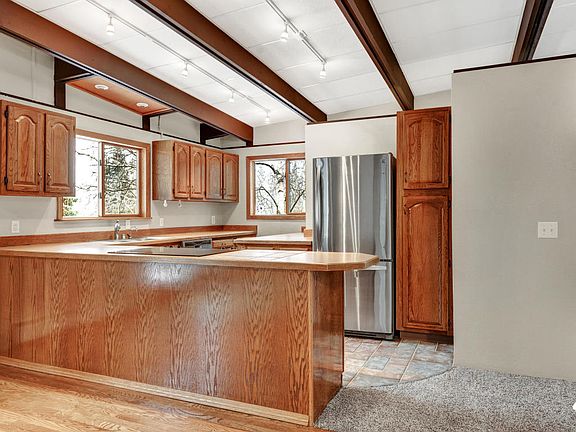 Unique hillside home with exposed wood beams. Large open living area great for entertaining! Lower living area has separate entrance - could be converted to Mother in law suite. Complete with oversized garage for toys or a shop. Private fenced in yard with mature trees and spacious deck for outdoor BBQ's.