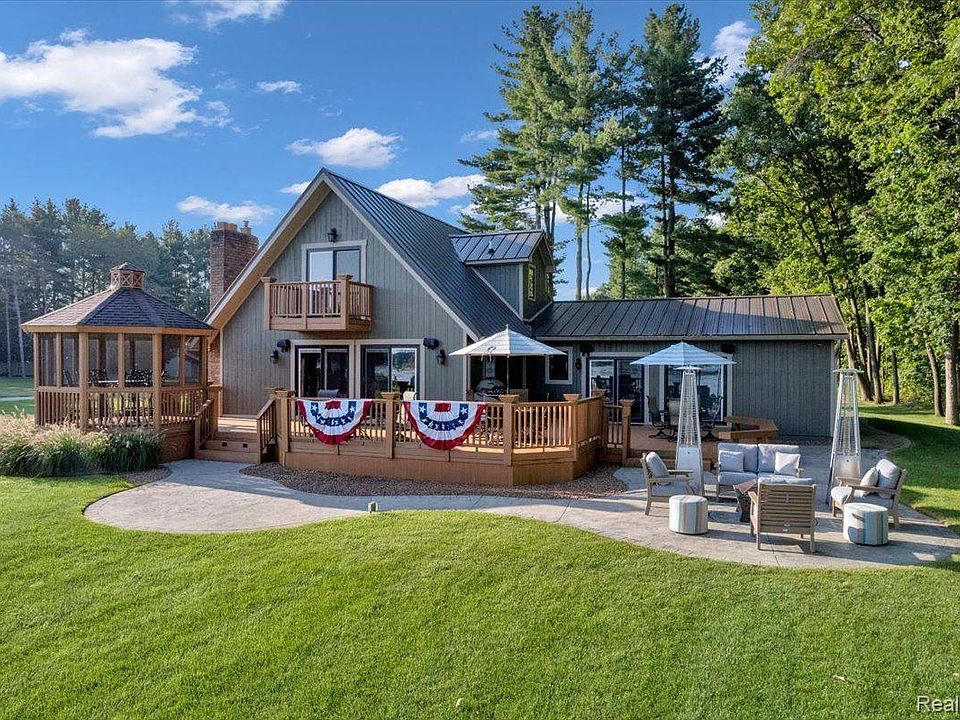 Outdoor living is a delight with multiple areas to relax, including an enclosed gazebo. Additional features include a lawn irrigation system, a 24 x 32 pole barn, a 14 x 24 shed, and a galvanized seawall stretching across the entire lakefront. Boating enthusiasts will appreciate the 4 lifts, including a pontoon lift and 2 jet ski lifts.