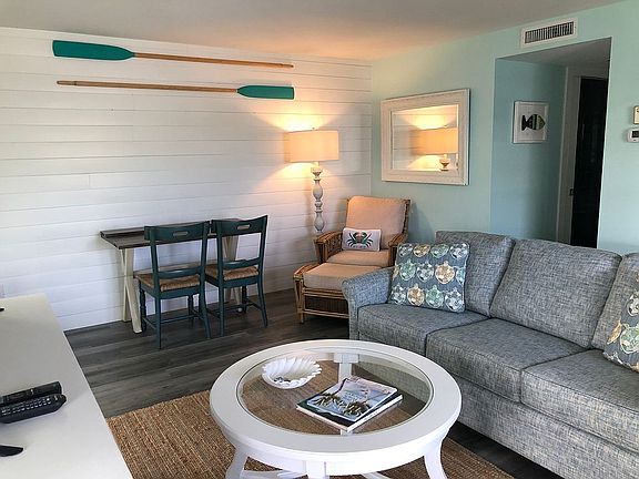 This must see newly remodeled condo, offered turnkey furnished! The condo property is located on the Gulf of Mexico with it's own private access to the gorgeous white sandy beach with no streets to cross. This spacious 1 bedroom, 1 bathroom condo has a bonus room/sunroom with a custom built queen Murphy bed and beautiful barn doors that close for privacy. The bedroom is very spacious with a walk-in closet. The newly remodeled spa like bathroom has custom made soft-closing cabinets with lots of storage and a stunning walk in shower with two shower heads. The kitchen has new cabinetry with soft-closing wide drawers, beautiful quartz countertops, coastal wavy backsplash and all new stainless steel appliances, and washer/dryer. The shiplap accent walls gives it a fresh coastal feel along with the new luxury laminate plank flooring that is waterproof/soundproof. Relax on island time in the heart of Holmes Beach. Walk to the free island trolley, shops, restaurants, hardware and marina. This fantastic 55+ community boasts 2 large pools, (1 is beachside/ 1 heated ), clubhouse, beautifully manicured landscaping and serene atmosphere with no disruption of weekly rentals. This gorgous condo is move-in ready, fully stocked with everything you need to call this home. Contact Owner: Brooke Laura: 240-893-8081 brooke.laura@gmail.com