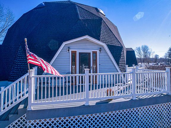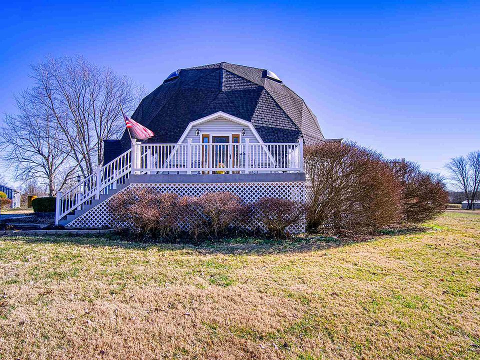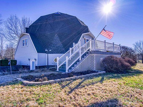 Unique, spacious and energy efficient one of a kind home on over 7 acres with a lake. This 4,000 plus square foot geodesic home is uniquely designed to maximize and utilize all interior space for your family's needs. While the home is designed to provide heating and cooling energy efficiency, the home's water furnace geothermal HVAC system further compliments this energy efficient residence. A wrap-around composite deck leads you into a large open great room with 27 ft dome ceilings. The recently remodeled kitchen offers tile flooring, white antique finished cabinets, ceramic backsplash, under counter LED lighting, large island and stainless Whirlpool appliances. Off of the kitchen is a laundry room with stackable washer and dryer. Two large bedrooms and a full bath are found on the main floor. The upper level has an open family area and a third bedroom with attached bath. The walkout basement has been waterproofed and offers even more entertainment space with wet bar and a fourth bedroom. There is also two storage rooms, a full bath and a second laundry room equipped for a side by side washer and dryer. The 18-20 Ft deep lake is fully stocked with catfish, bass and bluegill. The 20' resin deck is the jumping off point for swimming, boating and fishing. Mature trees provide plenty of shade for outdoor entertaining and activities. The 28 x 24 detached garage has attic storage; a garden shed area and space for a potential wood working shop. You must see this uniquely designed home to appreciate all it has to offer!
