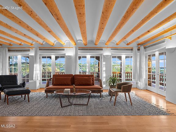 This stunning Santa Fe-style Foothills residence blends a perfect sense of timeless charm with modern comfort. It features four bedrooms and four baths, highlighted by Viga beam ceilings, warm wood and Saltillo tile floors, and four cozy wood-burning fireplaces. The chef's kitchen offers granite countertops, a large butcher block island, and abundant cabinetry. Enjoy multiple living spaces including a generous family room with a built-in bar that's perfect for entertaining or large gatherings. Stepping onto the wraparound balcony, you'll be greeted with breathtaking city lights and Catalina Mountain views while you relax by the sparkling blue pool and serene desert landscaping. A true Southwest retreat combining elegance, character, and unforgettable views.