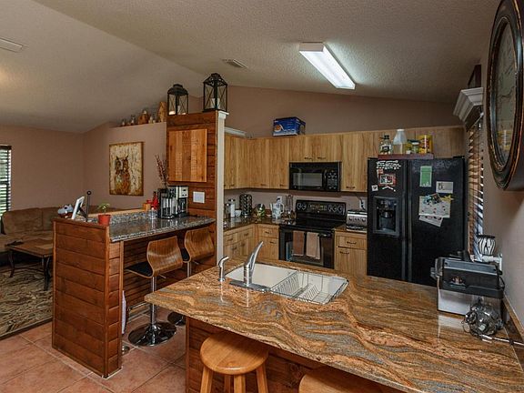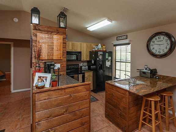 Dreaming of Country Living? This piece of Paradise with 2.38 cleared & fenced acres with drainage around the whole property & Zoned Au, with 4 barn stalls for horses, center isle barn plus 2 covered walk-outs. The lot also features mature Oak trees, 25x30 garage/workshop w/ 10 ft. roll up door. Immaculate 3 bedrm 2 baths split floor plan, garage has been turned into another room but could be converted back. Open kitchen with granite countertops, 18 inch tile throughout, Cathedral Ceilings, Plant Shelves, tiled screened in patio and much more! Septic and leach filed replaced less than two years ago. Less than 30 min to Beaches! Stucco cut