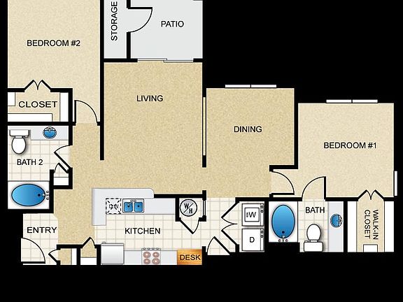 Dalton Floorplan on the second floor with big picture windows facing a private courtyard area. Corner of the building! No one above you! Two bedrooms, on either side of the apartment do not share any walls with eachother. Each as their own bathroom with large vanity, huge oversized mirrors, and garden tubs. Living room ceiling vaulted with a ceiling fan, open to the kitchen with a breakfast bar. Tons of kitchen storage and pantry. Coat closet, patio storage closet, and walk in closets in both bedrooms. Washer and Dryer included. Pets up to 75lbs welcome! 2 per apartment! 6 month lease options available. 1/2 month free off first full month's rent with 12 month lease