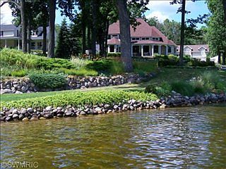 For details and more pictures, call listing Agent: Joyce Vos at (269) 488-0114. Exceptional Wall Lake Custom Home w/Guest House and 188' of beautiful sandy frontage. You'll fall in love with the floor plan, use of space and architectural features, from the LR w/20' ceilings and 2-way FP, dimensional roof/ceiling lines, custom flooring and trim with most wood (cherry, ash, walnut) all taken from property. Gorgeous built-ins, main floor master suite, laundry and den are w/covered porch, plus great kitchen with dining area opening up to the fantastic lake to enjoy your morning coffee. Upstairs are 2 BRs w/Jack and Jill baths, and loft area looking over the main level. The LL is of the same quality and has add'l BR w/full bath, family rm and your own room where current owner has a terrific golf simulator set up. You'll love this! A fully finished guest house with 1 BR, 1.5 baths and kitchen (minus stove,) and attached 2-car garage, in addition to 3-car garage attached to home. The grounds are beautiful! Complete list of amenities available.