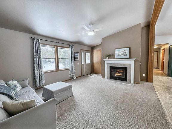 Nestled on 2.67 acres, this charming 3-bedroom, 2.5-bathroom ranch home is perfect for those who crave the serenity of rural living. As you step inside, you'll be greeted by a cozy living room w/ a gas fireplace, & vaulted ceiling, adjoining the dining room & kitchen, making it easy to entertain. Retreat to the master bedroom, featuring a master closet & en-suite bathroom with double sinks, whirlpool tub & water closet w/ shower. The full-size basement has an additional living/rec. space to enjoy a rock-climbing wall, bonus room, half bath & shop room that connects to the attached 2+ car garage for added convenience. With state land surrounding you & the river just a stone’s throw away, you’ll love the easy access to trails right from your backyard. Blueberry, raspberry and grape bushes waiting for you to enjoy in the warmer months. Direct access to snowmobile, biking trails ATV/UTV trails, and is near public hunting land & many boat landings. Hot tub included! Check out for yourself!