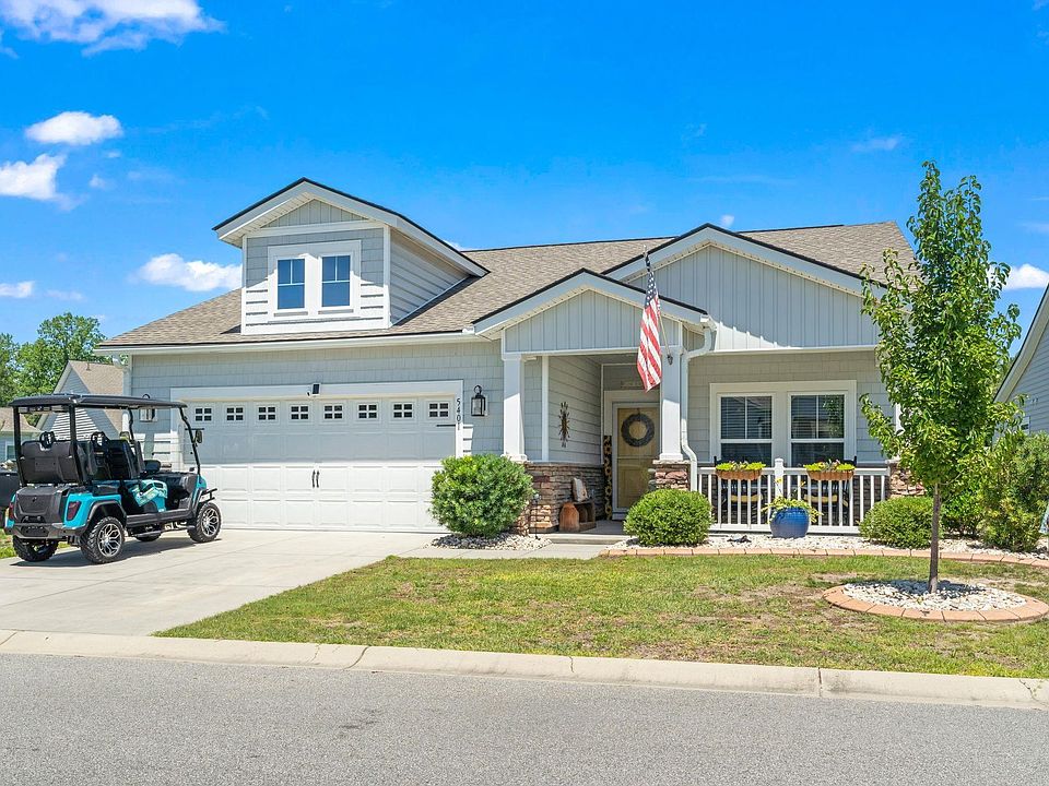 Welcome to The Bradford, a charming 3-bedroom, 2-bath home complete with a 2-car and golf cart garage. Situated within the highly acclaimed, guard-gated community of Legends Golf Resort, Gleneagles Cottages offer an unparalleled lifestyle. The home features exquisite Mohawk Cedar View Laminate flooring, 42" staggered white kitchen cabinets, sleek stainless steel appliances, elegant granite countertops, a 3x6 subway tile kitchen backsplash, and a tankless water heater. The heart of The Bradford is its expansive living space, seamlessly connecting the kitchen and dining area under a vaulted ceiling, creating an inviting, open, and airy ambiance. The primary suite is a serene retreat, boasting a stylish tray ceiling and an ensuite with a floor-to-ceiling tiled shower, a walk-in closet, and a double sink vanity. Two well-appointed guest rooms provide access to the guest bathroom, ensuring privacy and comfort separate from the primary suite. Designed for those who prefer minimal outdoor upkeep, this detached single-family home offers the privacy of a standalone residence without the hassle of a condo or townhome. The Gleneagles community is conveniently located next to three award-winning golf courses and the Ailsa Pub, a Golf Digest-rated restaurant and bar popular with residents, guests, and golfers. Just a short drive from the beach, this community is also close to Myrtle Beach's top restaurants and attractions. The HOA offers a range of amenities including gated security from sunset to sunrise, lawn service, a sprinkler system, waste management, and community maintenance. Residents and guests can enjoy pools, a hot tub, tennis courts, and pickleball. Short-term rentals allowed! Measurements are not guaranteed. Buyer is responsible for verifying.