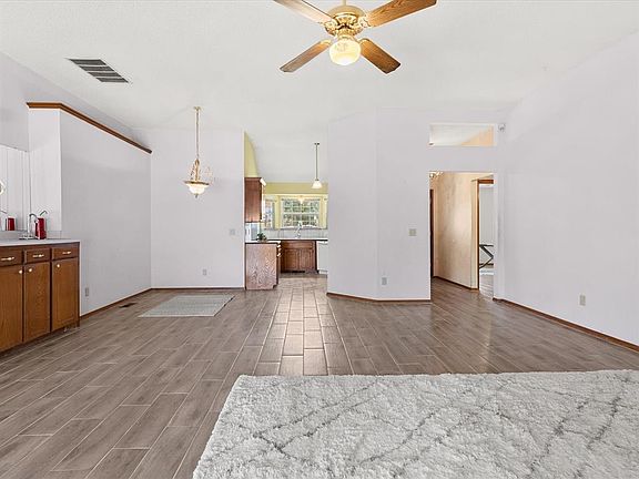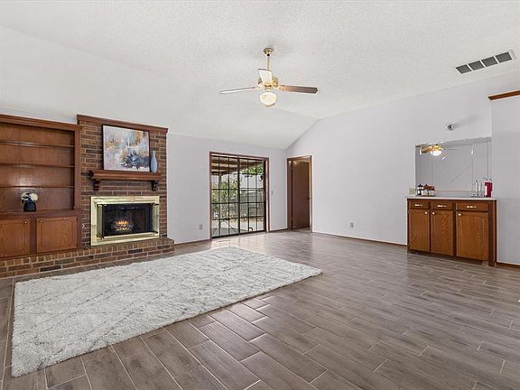 This SWEET Home has 3Beds + 2Baths in MOORE Schools! LARGE Living Room with SOARING Ceilings & Brick Fireplace with Built-in Shelves ~ BEAUTIFUL Tile Flooring flows from the Entry into the Living Room, Dining Area, Built-In Coffee Bar, Front Bedroom, Hall Bathroom, Hallway, Kitchen & Utility Room! Vaulted Ceilings in Primary En-Suite with Double Vanities, Corner Jetted tub, Walk-in Shower, & Walk-in Closet ~ 2 BIG Guest Rooms ~ NICE Sized Hall Bathroom with Tub & Shower Combo ~ Linen Closet with Hamper Just Outside the Hall Bath ~ Oversized Garage with Above Ground Storm Shelter; Large Shelter removes some parking space in the Garage, but One Full-Sized Vehicle can still easily park in the Garage ~ Backyard Boasts a Covered Patio with Plenty of Room for R&R or Entertaining ~ Welcome Home!