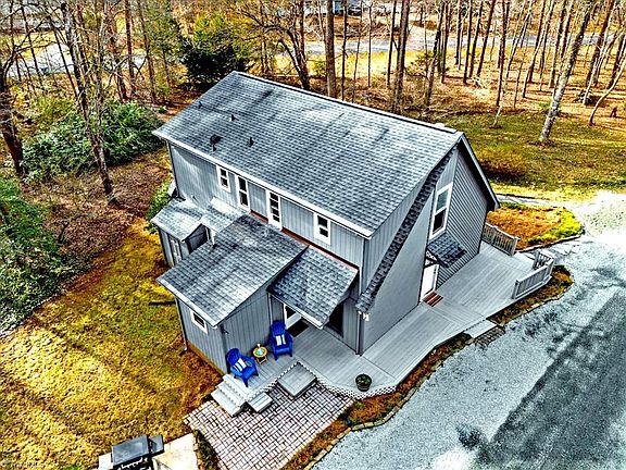 Charming A-frame home on 6+ acres of partially wooded land—NO HOA and USDA eligible! The main level features an open living and dining area with hardwood floors and a cozy wood stove. The spacious kitchen offers a breakfast area, pantry, island, stainless steel appliances, and an induction cooktop with dual ovens. The laundry/mudroom provides easy access to concrete patio and outdoor entertaining. The main level primary bedroom conveniently placed with access to living room, stairs and kitchen. Upstairs, enjoy a flex space for an office or rec room flanked by two generous bedrooms and a full bathroom. Outdoor highlights include a wraparound porch, grill, two storage buildings, a greenhouse with cleared garden beds, and a nature path leading to a partially fenced pasture with a shelter—perfect for farm animals! Lots of possibilities with a short commute to Greensboro or Burlington.