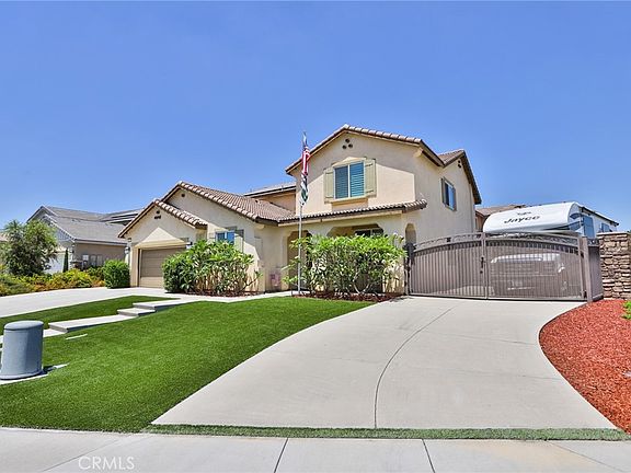 ***See Our Virtual Tour ***TurnKey*Pride of Ownership* Built by Lennar homes in 2018. This 5 bed, 3 full bath home feels far bigger than the sq. footage advertised. From the moment you pull up to the corner lot home, you will be in awe with its curb appeal, but that will be far surpassed when you enter and see what this home has to offer. The Foyer is long and inviting and has fingers that sweep into the home's downstairs bedroom, the office and formal dining room. The designer paint throughout the home is elegant and tastefully done and matches the Tile "Plank" Flooring and highly upgraded carpet and padding. The transitions are smooth and seamless as you enter the Kitchen which is a chef's dream accented with "Rich" Dark Wood Cabinetry, Granite Counters expansive "Walkin Pantry" and all matching GE appliances. As one stands at the center island the view of the massive great room creates a visual of one's family enjoying family time together! The upstairs part of the residence is large and open and offers a teen entertaining room and 4 more spacious bedrooms and joint bathroom that offers a walk-in shower and dual sinks. The Master Suite is the piece-de-resistance! The room feels like your own personal hideaway from the world. The photo's do not do it justice. The Master Bathing area is accented by Quartz Counters, dual sinks a separate vanity area as well as large tub and separate shower, truly the best as one would expect in a home like this! As one continues past the shower, the walk-in closet is a welcome surprise! Almost as large as another bedroom, one will find all the room needed to store one's clothing etc. Last but not least; the rear yard is lavish and immaculately decorated with Plumeria and humming bird feeders. The pool is decedent and well laid out as is the covered patio and dual fans and side yard which are off the rear door of the home. I would be remiss if I didn't point out the huge RV Access area. The just over 36’ by 16' area (at its narrowest) is perfect for storing ones RV's and toys as is the massive 4 car tandem garage. Near by fine dining, shopping and entertainment galore and provides easy freeway access and comfortable traveling to San Bernardino, Orange and Los Angeles Counties! Add in the Solar System which is paid off and one has found the ideal home.