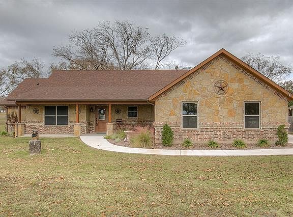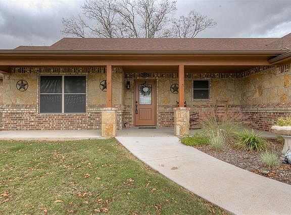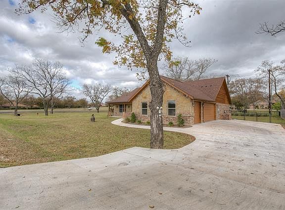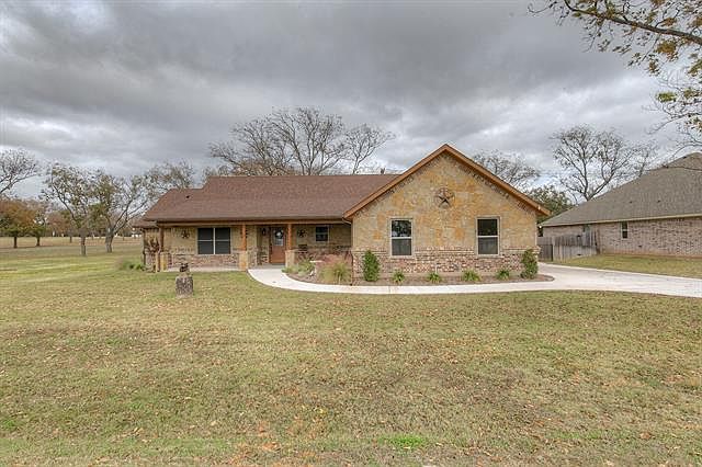 Custom built Farm Style home in prestigious gated Pecan Plantation. This 3 bed 2 bath golfcar garage home has beautiful stone accents. Warm & cozy makes this home stand out from the rest! Open floor plan, with vaulted ceilings, accent beam, fireplace, custom wood mantel. Custom cabinets throughout, granite counters, stainless steel appliances, farm sink. Master has trey ceiling, crown molding en suite with walk-in shower with glass door, his and hers sinks, and an oversized closet. Enjoy afternoons on the covered patio nestled in the back yard. Non buildable lot next to home with game of horseshoes for family fun! Walk to the Nutcracker driving range or enjoy the private aircraft, this home will not last long!